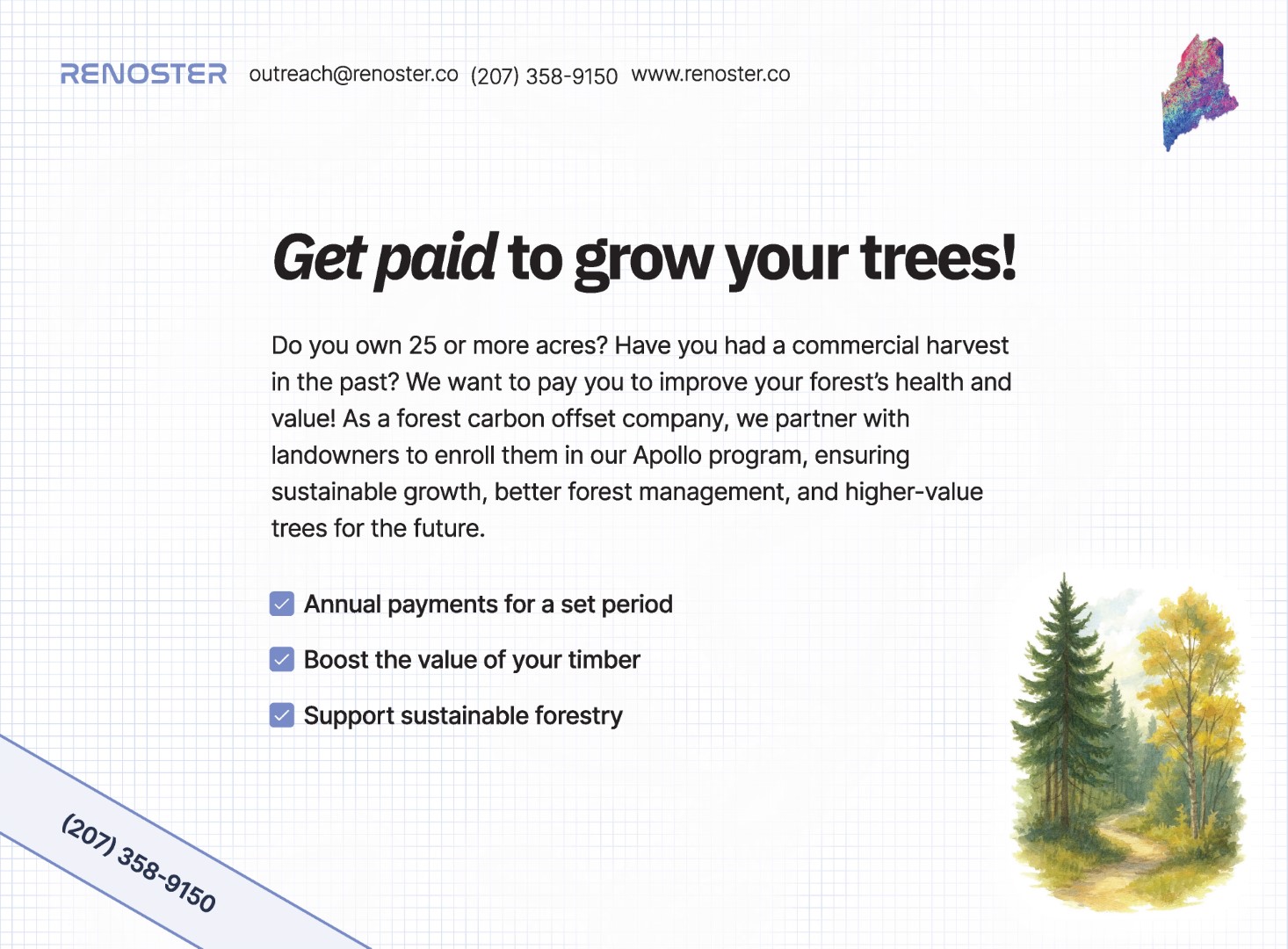For more information and to see if your land is eligible call 207-358-9150, email: outreach@renoster.co or to learn more visit www.renoster.co <