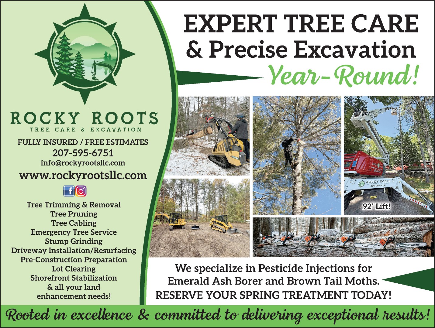 To learn more about how Rocky Roots Tree Care & Excavation can help with your next project or to schedule a free estimate, visit www.rockyrootsllc.com or call 207-595-6751. <