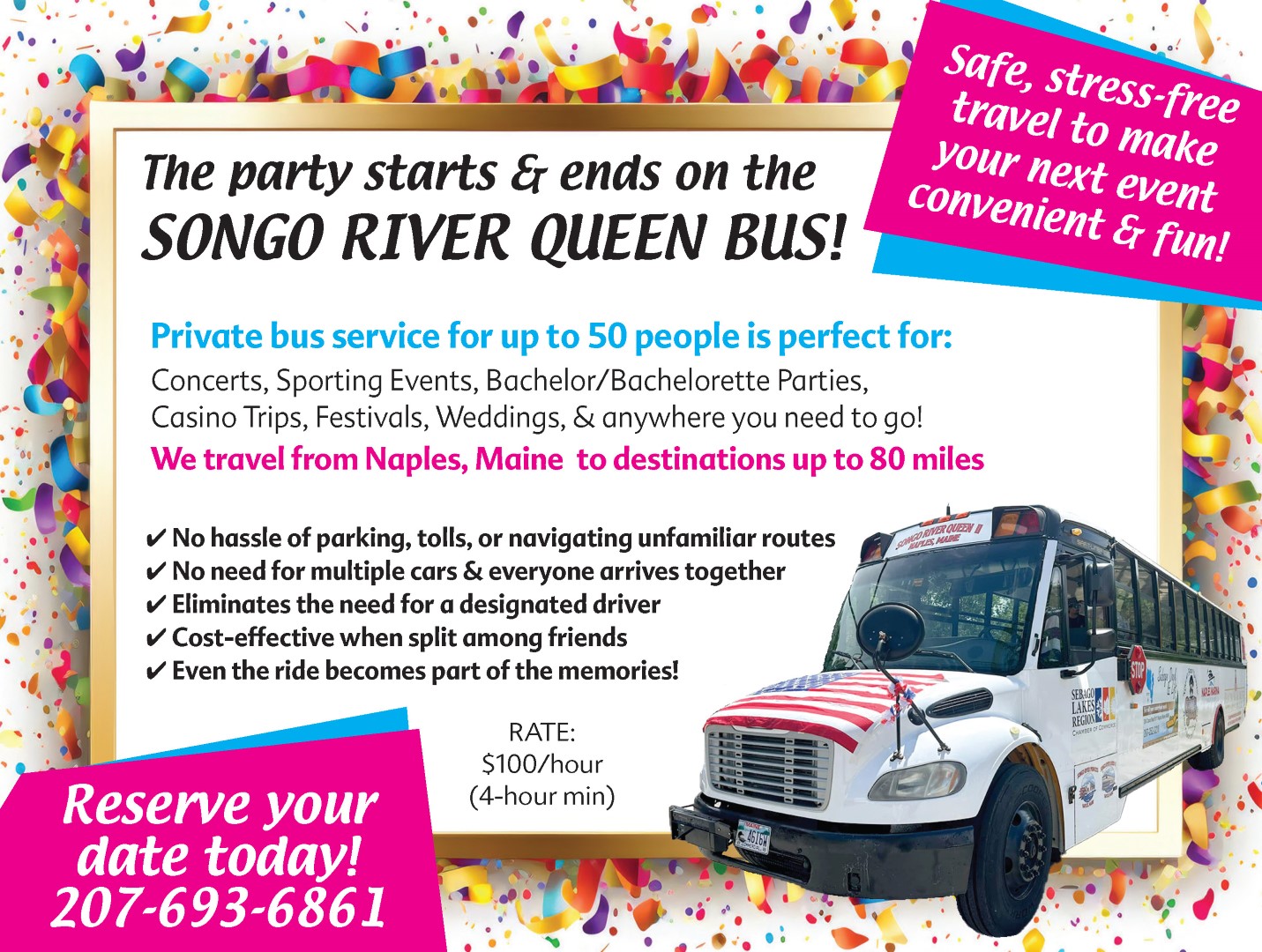 So, the next time you and your friends are planning a trip to a show, a game, or a night on the town, consider leaving the cars at home. Step aboard the Songo River Queen Bus, settle into your seat, and enjoy the ride. The destination will be worth it, but chances are, you’ll find that the journey is just as much fun.