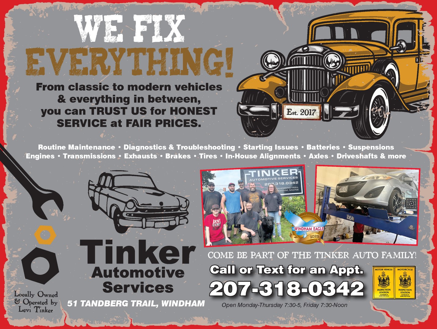 Tinker Automotive Services assists its customers in maintaining safe and reliable vehicles, and offering the community honest, reliable, and exceptional service. FMI or to make an appointment, call or text 207-318-0342. Follow them on Facebook. <